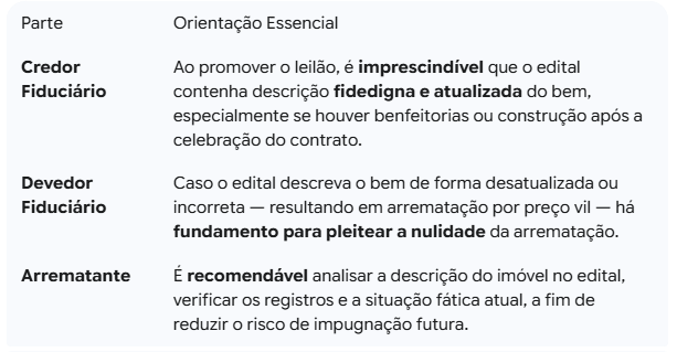 - Quando houver valorização do imóvel — por exemplo, em razão de construção ou benfeitoria —, a descrição no edital deverá acompanhar a situação fática atual, sob pena de implicar arrematação por preço vil, violando o direito do devedor e afetando a lisura do processo.
